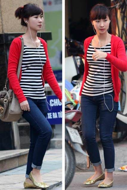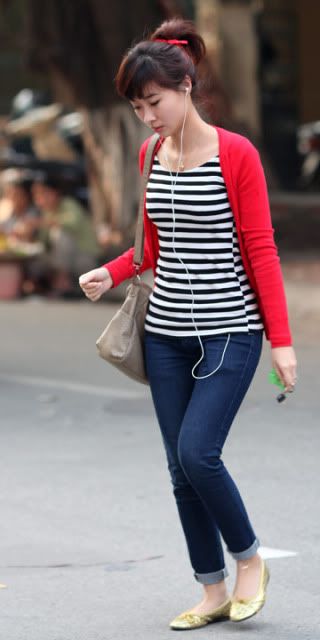 Cardigan và jeans xắn gấu khiến một bạn gái khác trông năng động. Đôi giày bệt ánh kim làm trang phục trở nên có gu hơn rất nhiều.